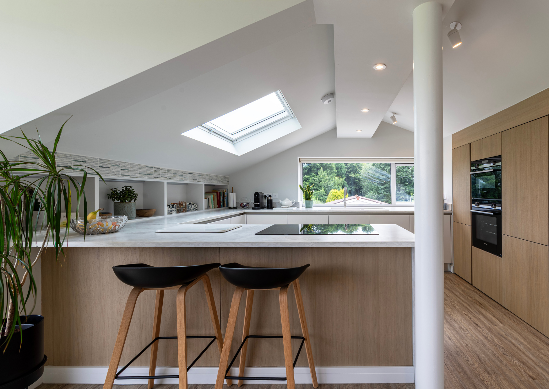 By painting the dark brown brickwork white and introducing panels of feature tiles externally and internally we created a whole new aesthetic for their home. Windows were upgraded to white aluminium and floating flat roofs created an entrance canopy and solar shading to the rear master bedroom. Using simple and cost-effective techniques we have truly brought the spaces and the exterior to life.